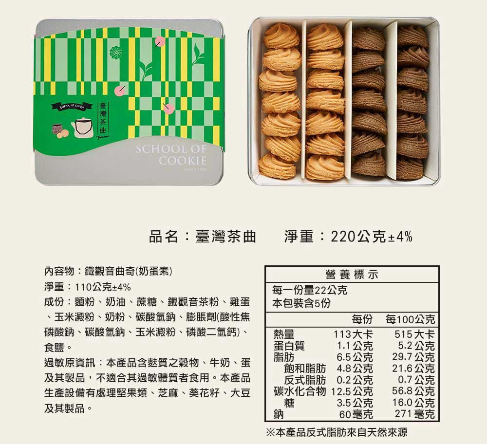 純天然奶油搭配雙口味曲奇餅乾鐵盒,不管是喜歡天然味道綿密紮實口感, 還是最愛鐵觀音茶那股抵擋不住、唇齒留香的餘韻,兩種口味一次滿足! 奶酥又稱為曲奇,因為單純綿密的口感讓每個年齡層都為之瘋狂。
